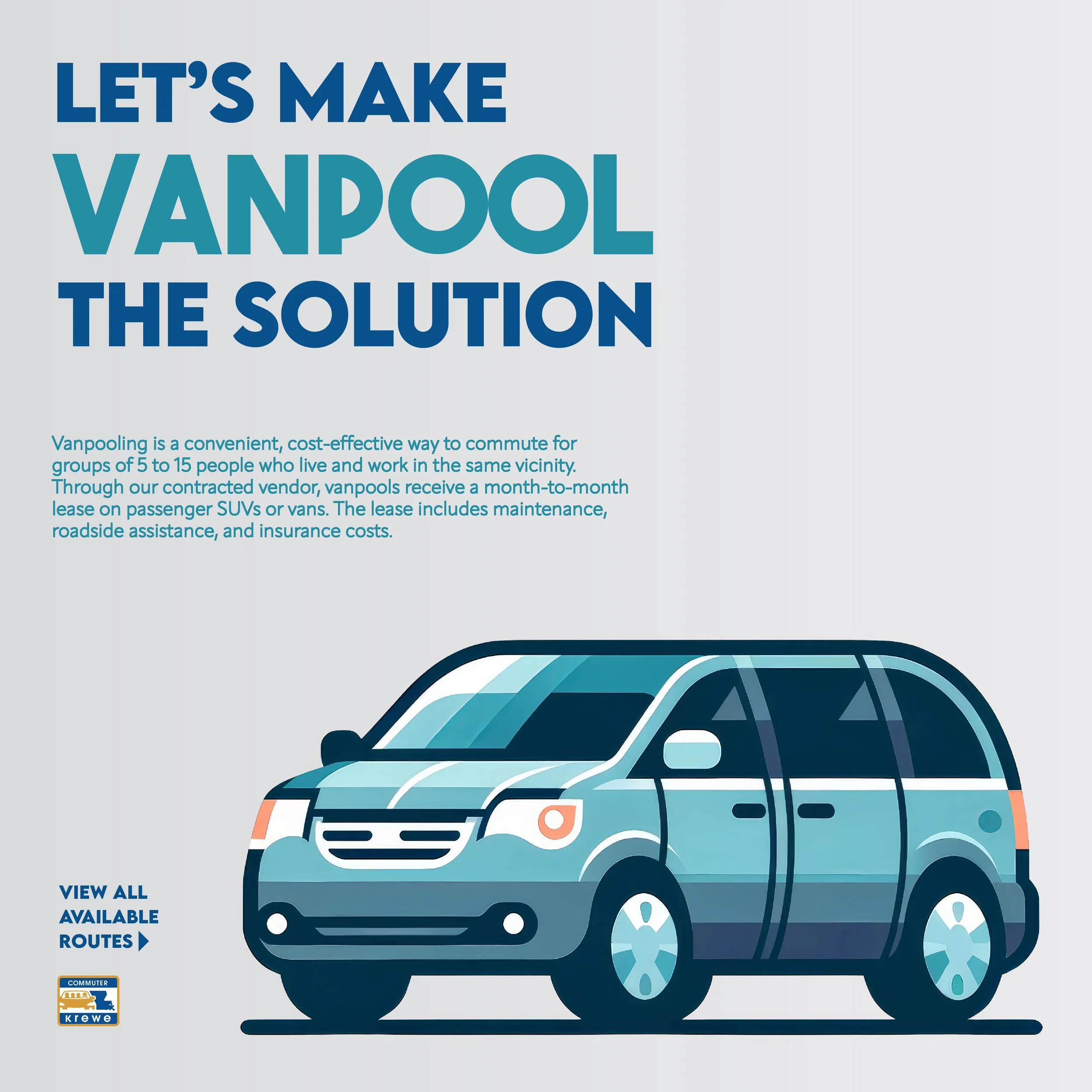 Vanpooling is a convenient, cost-effective way to commute for groups of 5 to 15 people who live and work in the same vicinity. Through our contracted vendor, vanpools receive a month-to-month lease on passenger SUVs or vans. The lease includes maintenance, roadside assistance, and insurance costs.